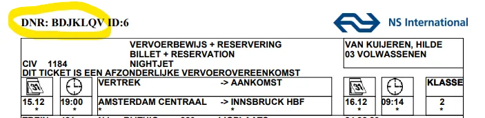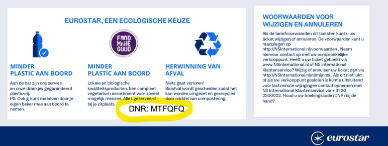 Heeft u gereisd met de Eurostar van of naar Parijs (voorheen Thalys)? Dan kunt u - als u via Treinrondreis heeft geboekt - de claim indienen bij NS International via deze pagina. Als u zelf de tickets heeft gekocht, kunt u de claim indienen bij de vervoerder die het ticket heeft uitgegeven. Als je compensatie bij NS aanvraagt, heb je de boekingscode nodig (DNR), die staat onderaan op het Eurostar ticket. Voorbeeld: