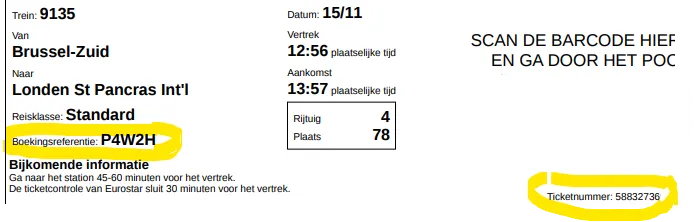 Heeft u met de Eurostar van en naar Londen gereisd? Dan kunt u alleen compensatie bij Eurostar zelf indienen. Je hebt dan de boekingsreferentie en het ticketnummer nodig. Die kun je vinden op het ticket. (Om veiligheidsredenen is de QR-code weggehaald). Voorbeeld: