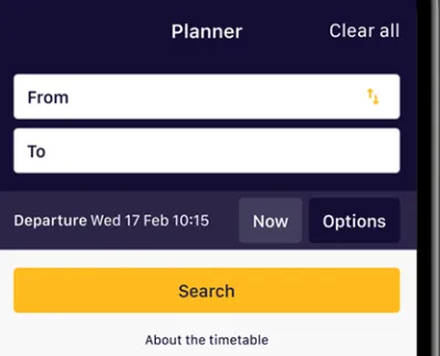 Kun je jouw reisschema niet vinden? Dan kun je eventueel per trein de reis plannen en opslaan. Lukt het nog steeds niet? Dan kun je handmatig een reis toevoegen. In de reisplanner is ook een knopje "Options". Daarmee is het mogelijk om bijvoorbeeld in te stellen dat je alleen rechtstreekse treinen wilt.