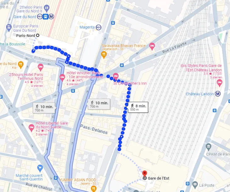 De wandeling tussen de stations is rechtdoorzee en goed bewegwijzerd. Wanneer je het Gare du Nord verlaat via de hoofdingang, sla je linksaf. Volg deze weg (Rue de Dunkerque) ongeveer 300 meter rechtdoor. Al snel zie je de karakteristieke sporen van het Gare de l'Est voor je liggen. De stationshal bevindt zich aan je rechterzijde.
