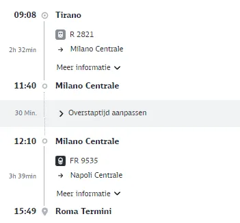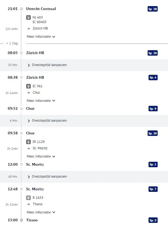 We maken voor u een persoonlijk reisschema. In de zomermaanden zullen er naar verwachting werkzaamheden zijn, waardoor vanuit Tirano naar Milaan een deel van de treinrit wordt vervangen door een bus. Dit is het globale schema van de reis, gerekend vanaf Utrecht.