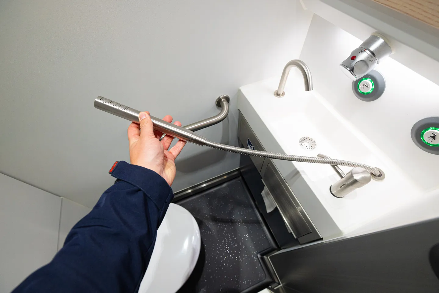 - Privétoilet in de coupé, met uitrekbare douchekop (geen aparte douchecabine). Kleine handdoek en zeep aanwezig