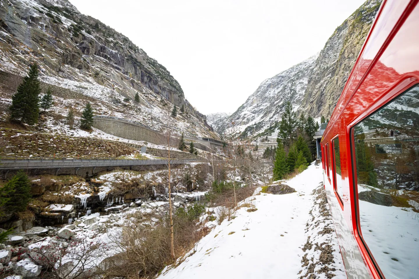 Tussen Andermatt en Göschenen daalt de trein snel af door de Schöllenenkloof, langs besneeuwde hellingen, korte tunnels en de historische Teufelsbrücke. In enkele minuten verandert het open winterlandschap rond Andermatt in een ruige kloof, waarna je in Göschenen aansluit op de Gotthardlijn.